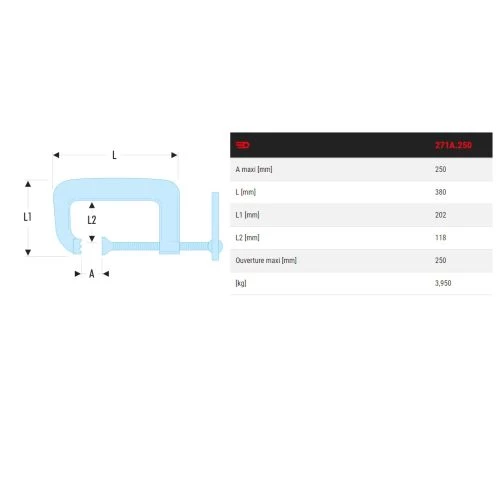 La presse faible encombrement 271A de la marque Facom dispose d’une ouverture maximum jusqu’à 250 mm.