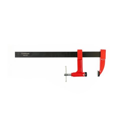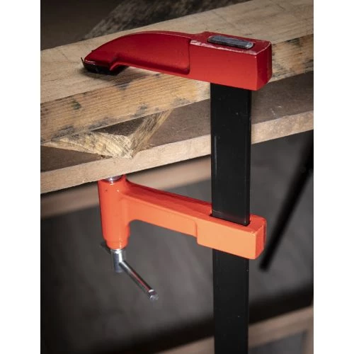 Serre-joints à pompe avec frein de blocage. Protections plastiques aux mors, valet et coulisseau en fonte GS, protégés époxy.